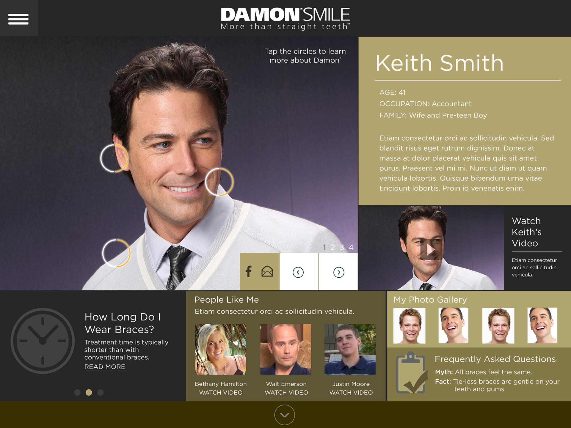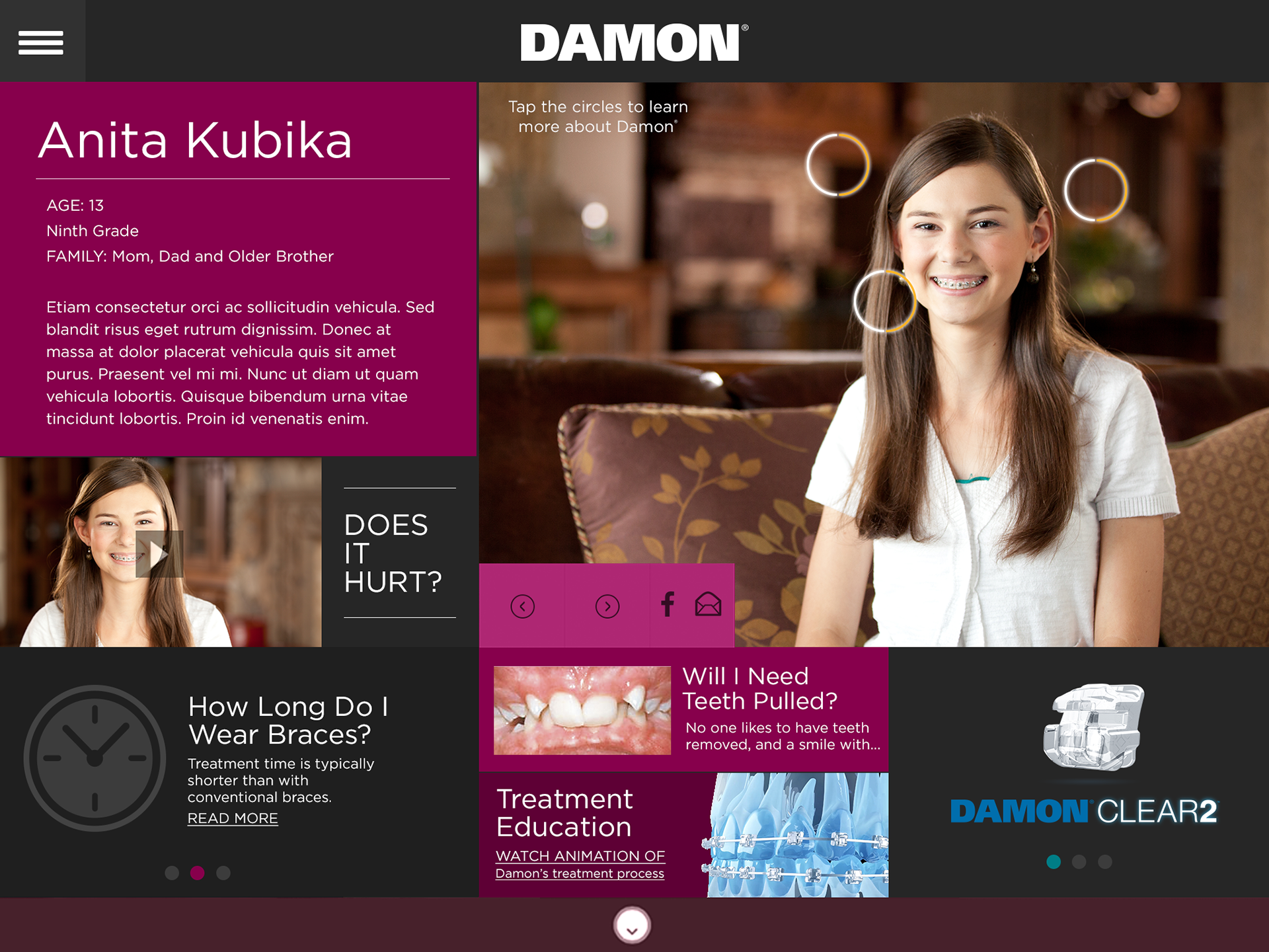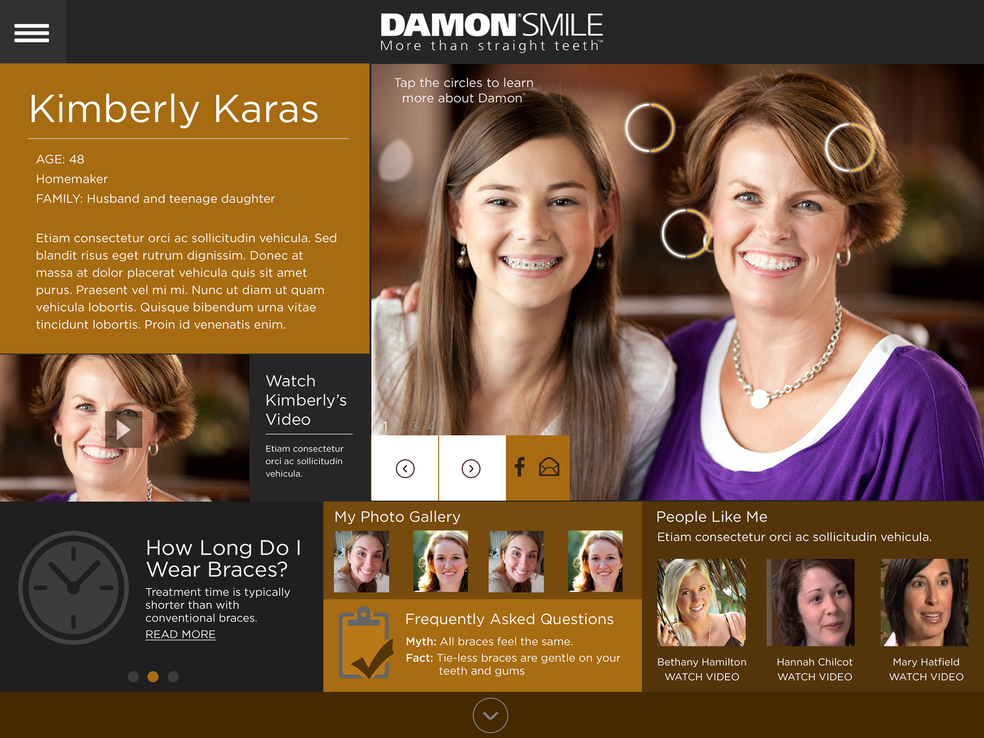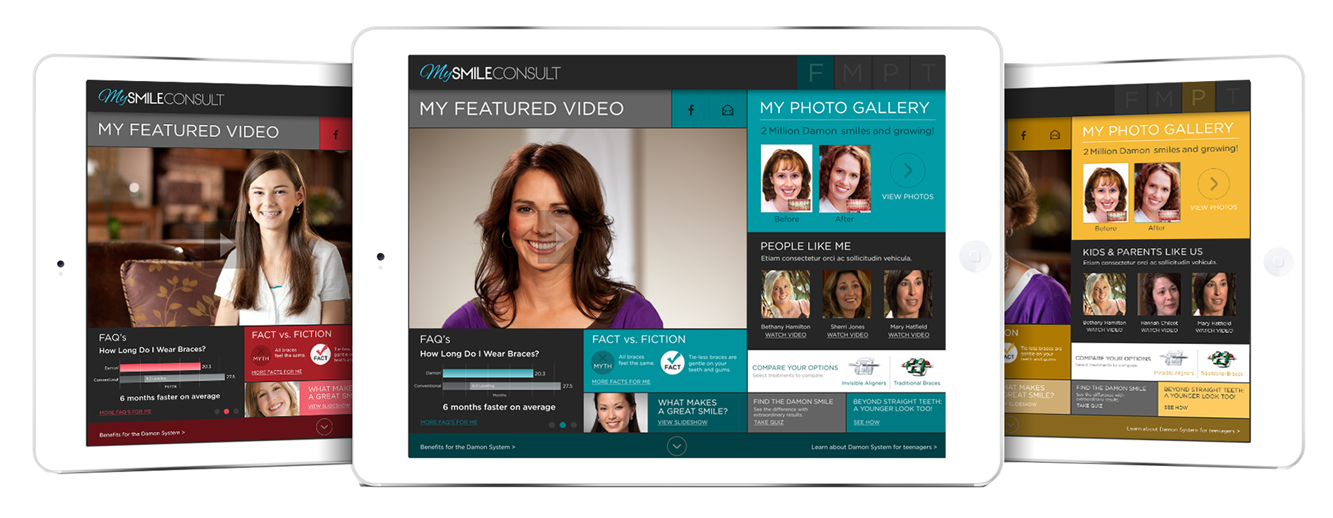 If you think all orthodontic treatments are the same, think again. Orthodontics has changed more in the past 20 years than the previous 100 years. Today, your specially trained orthodontist can offer treatment that’s healthier, more comfortable, and faster than ever before. The results go beyond straight teeth. Now it’s about wider, more beautiful smiles, healthy teeth and gums, and enhancing the entire face – for a lifetime. Damon System required a consultation tool for Orthodontists to showcase to multiple audiences the many facets and features of the Damon System including video, photos, FAQ’s, etc.