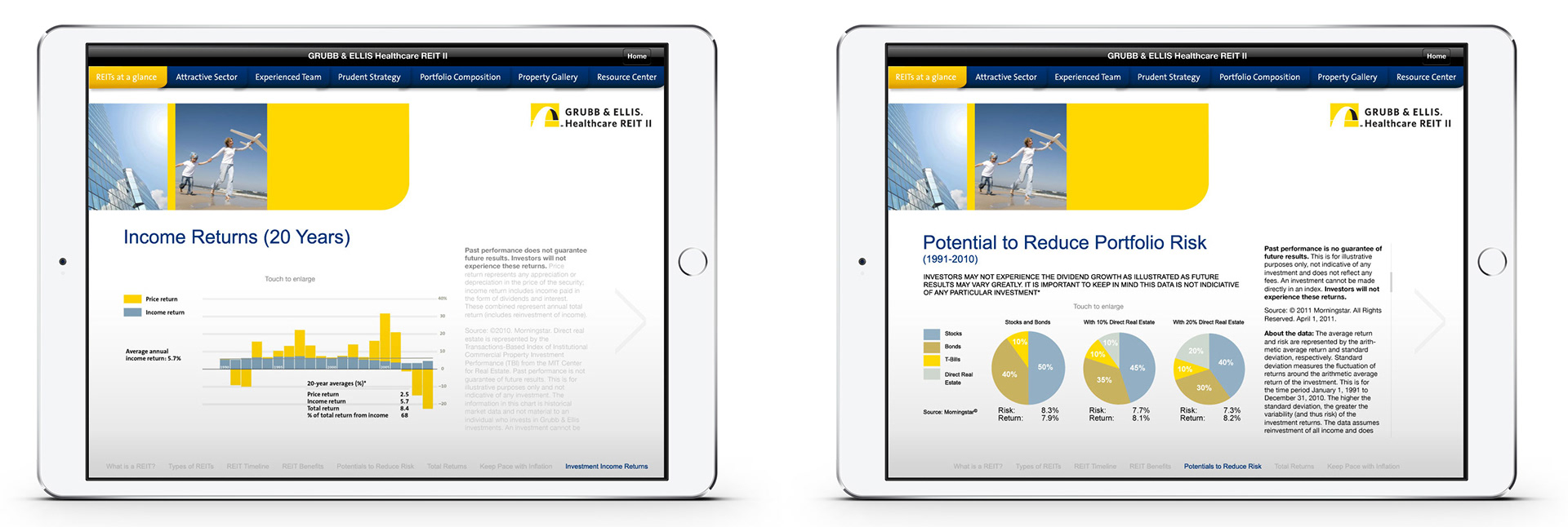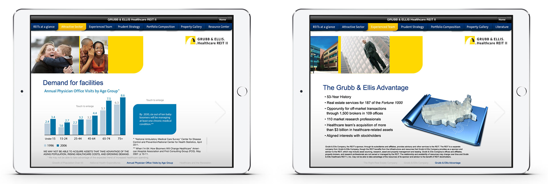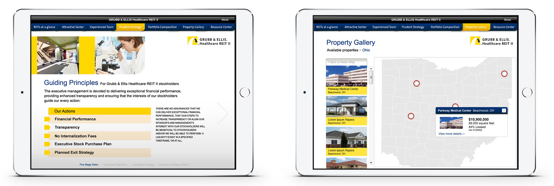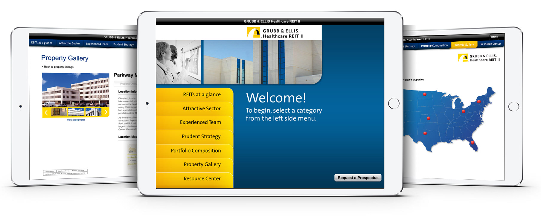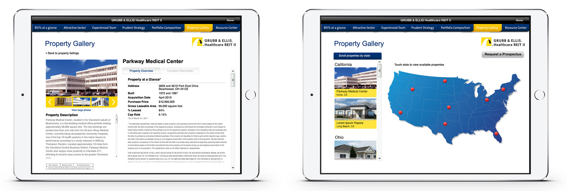 Grubb & Ellis requested an app for their field reps to have up to date property information including interactive nationwide map, resource center, photo gallery and ability to request more information.